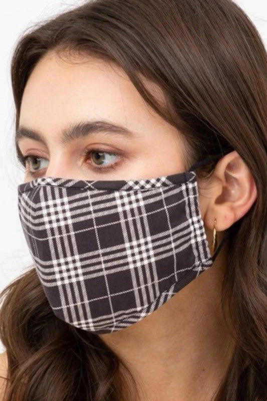 Comfortable black & creamy white plaid cotton shaped double layer face mask with nose wire for a snug fit, adjustable black ear loops and filter pocket. A good citizen accessory for keeping your breath to yourself while we’re stuck in this Corona-verse :/