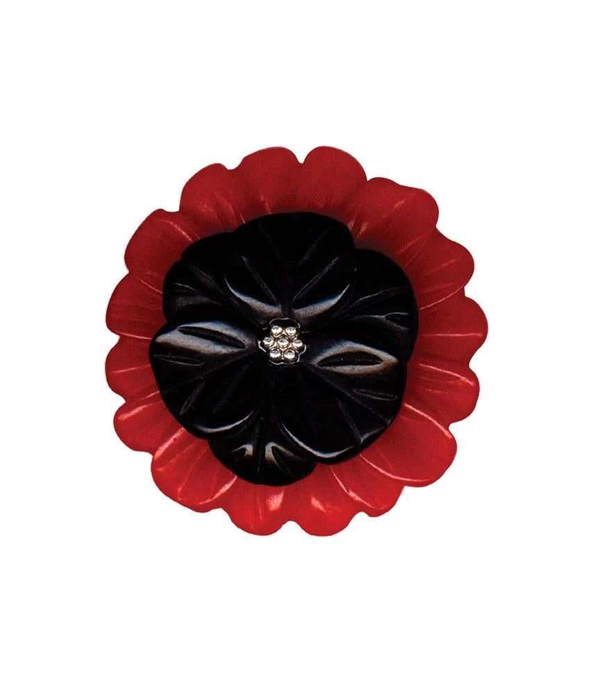Sweet red & black layered Retrolite multi-petal flower brooch with silver metal center, made in the U.S.A. by Classic Hardware