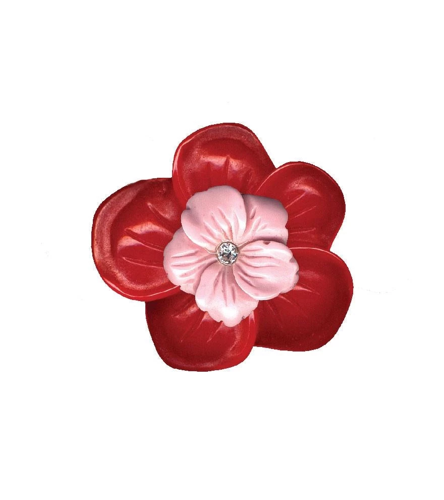 Sweet red & dusty pink layered Retrolite multi-petal flower brooch with sparkly clear “rhinestone” center, made in the U.S.A. by Classic Hardware