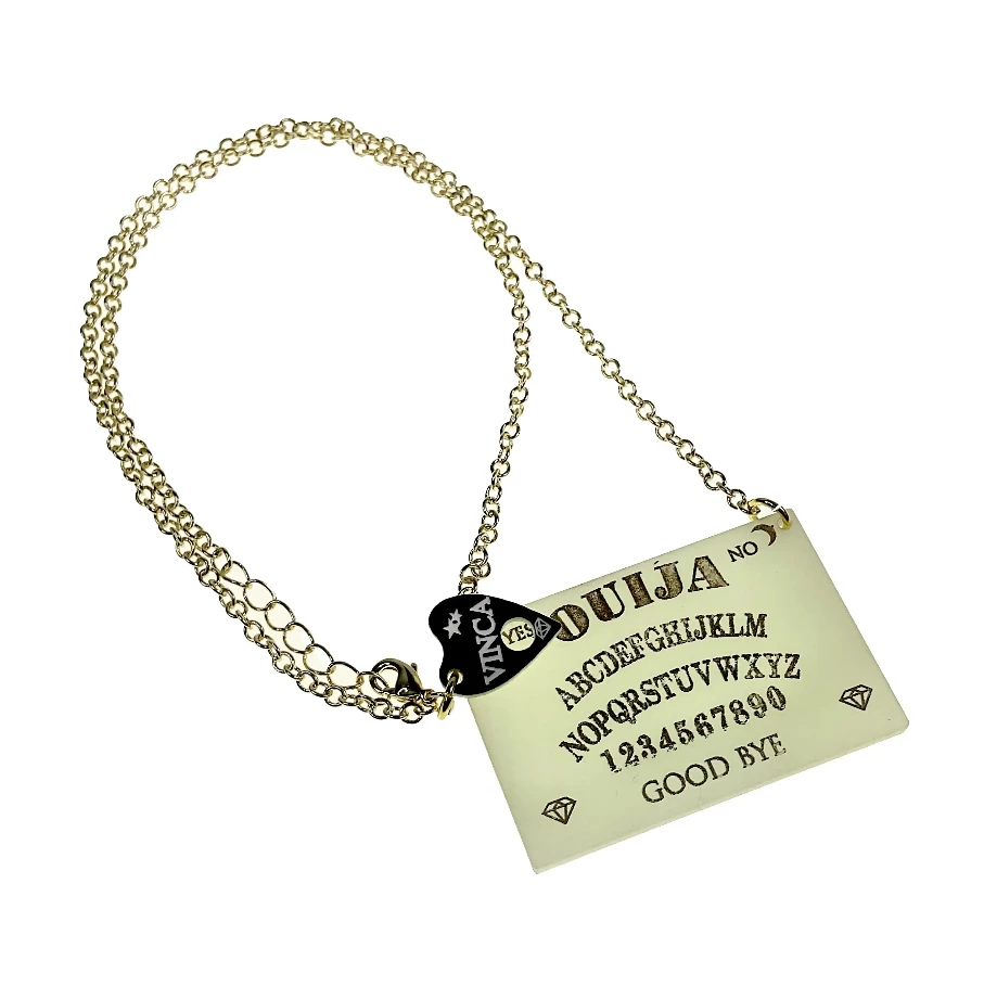 Spooky! “Ouija Look at This!” glow-in-the-dark laser acrylic Ouija Board pendant with gold lettering on 18″ – 19″ gold metal link chain with tiny black & white planchette charm by the clasp. Made in the U.S.A. by Vinca.