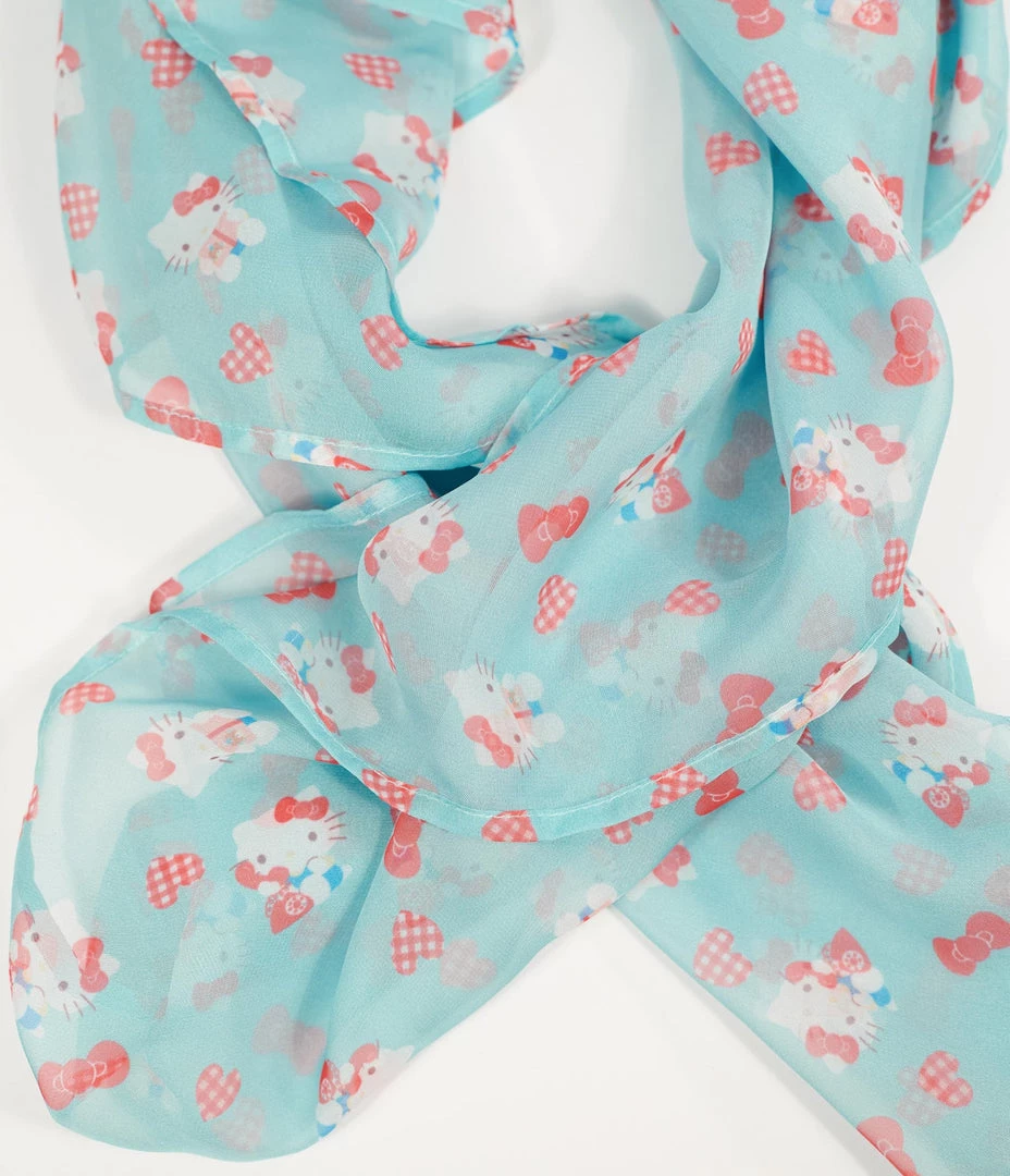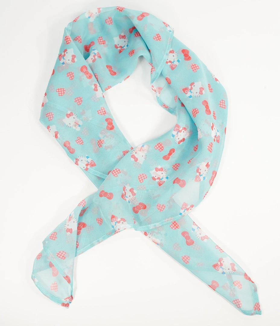 Hello Kitty x Unique Vintage collaboration retro style mint* with allover Kitty, red bow, and red & white gingham hearts print 28″ square sheer chiffon scarf –cute in your hair or around your neck!