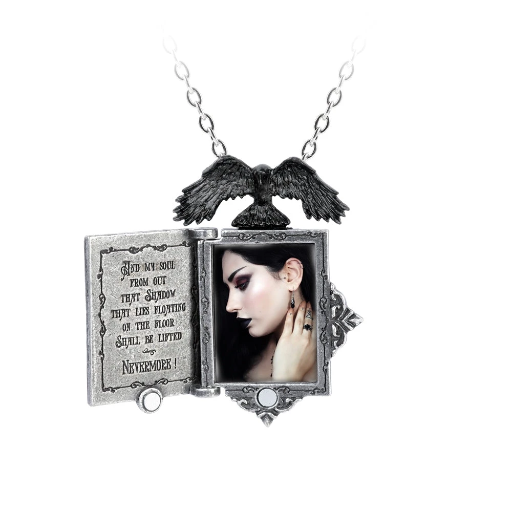 Gorgeous replica of the 1st Edition book cover of Poe’s The Raven depicted on a magnet closure locket pendant topped with a spread-winged black raven, on 21″ silver metal chain, by Alchemy of England