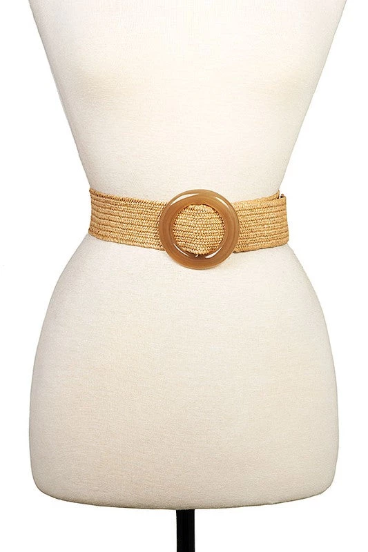 1 3/4″ wide woven stretch belt in versatile tan with camel color circular acetate buckle — a lovely summery accessory for retro or modern ensembles!