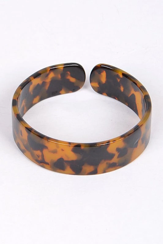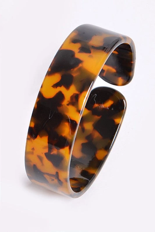 Beautiful 3/4″ wide faux tortoiseshell bangle –striking as a single accessory, and perfect for adding a bit of pattern to your bangle stacks!