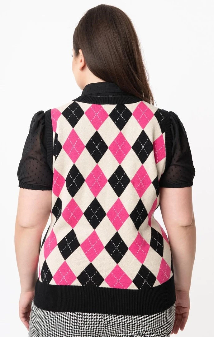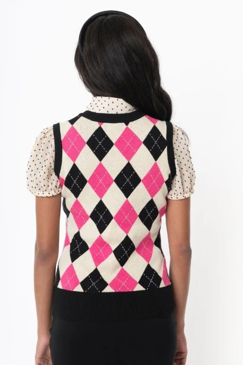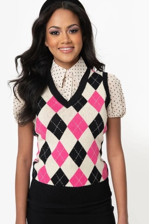 Brando bright pink, cream, and black v-neck argyle pattern sweater vest from Unique Vintage – a cozy classic in a sassy colorway