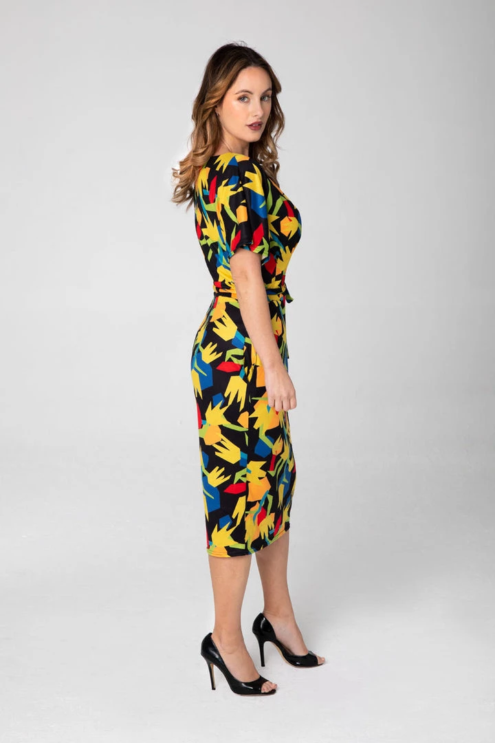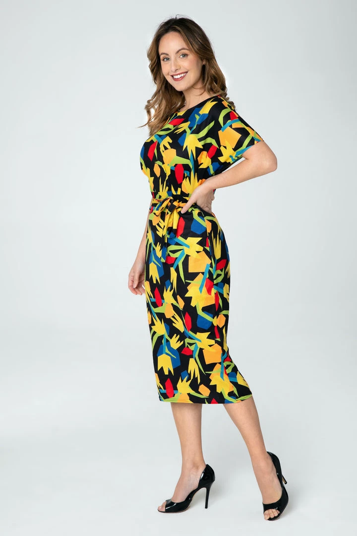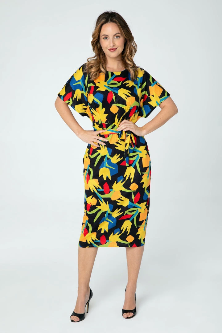 Geometric Tulips Print knit dress from Miss Lulo –this soft & stretchy black background floral beauty features a jewel neckline, short dolman sleeves, removable self sash belt, pencil silhouette just below the knee length skirt…and pockets!
