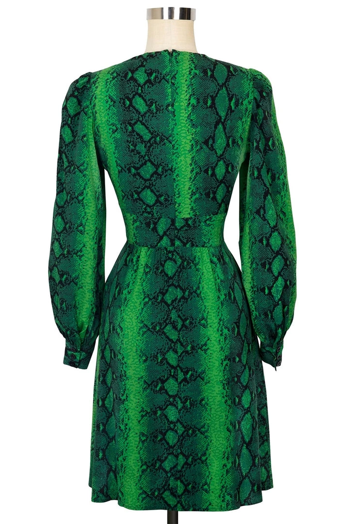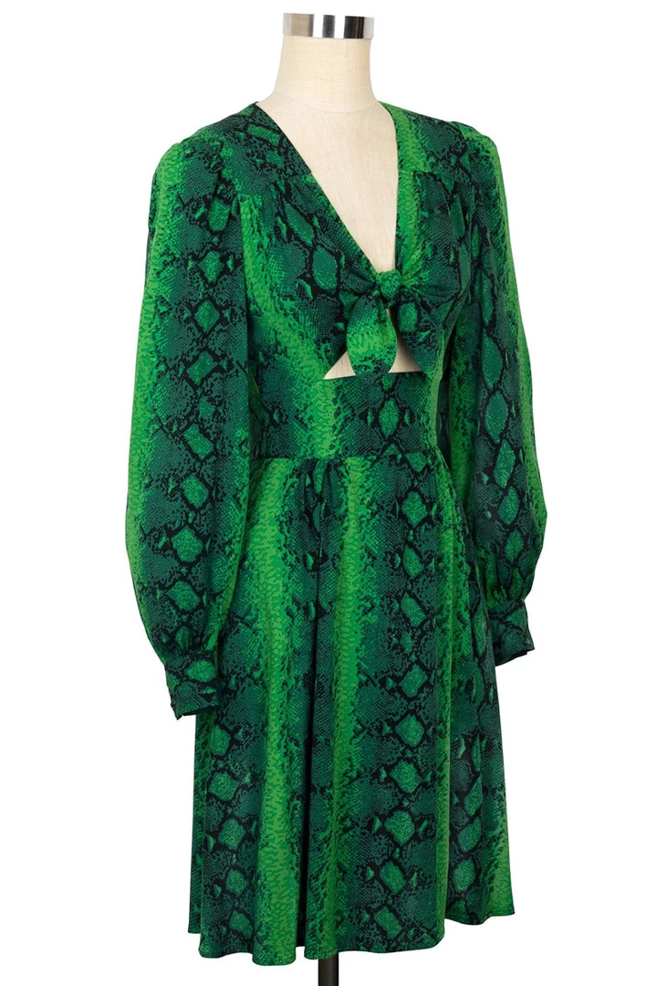 Emerald and black “Green Snake” print stretch rayon Ida Dress from Trashy Diva, featuring long full sleeves ending in wide cuffs, flattering deep v-neckline with flirty peek-a-boo adjustable tie closure at bust, fitted wide waistband, flared knee length length skirt…and pockets!