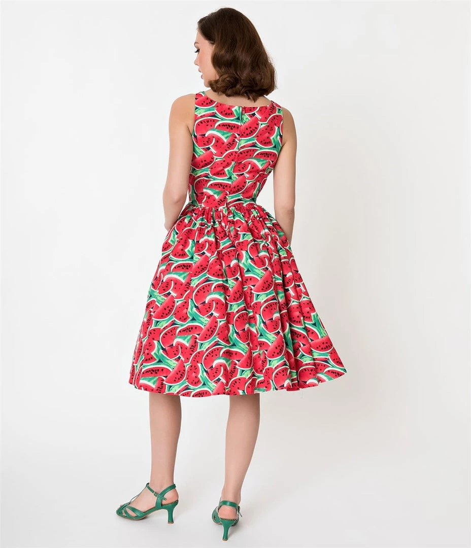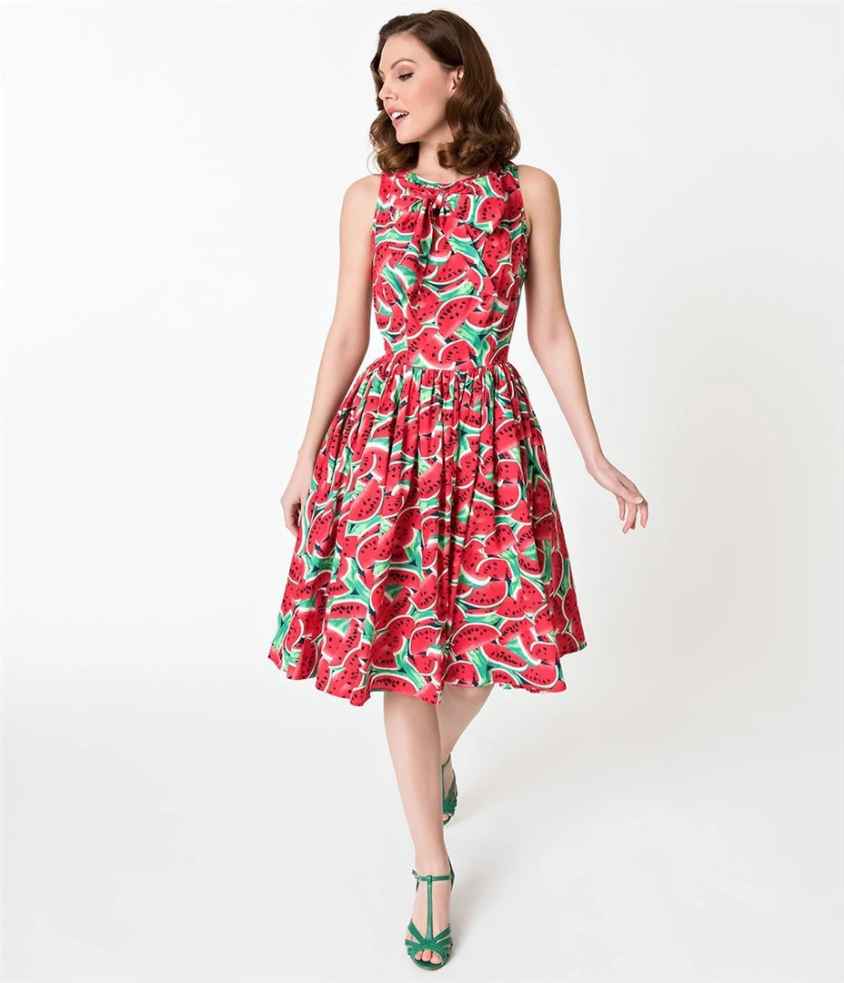 Pretty watermelon print sleeveless dress with fitted bodice, lovely ladylike bow detail at neck, gathered full circle swingy knee-length skirt, and pockets! –this 100% cotton cutie is ready to keep you feeling cool at all your summertime dos!