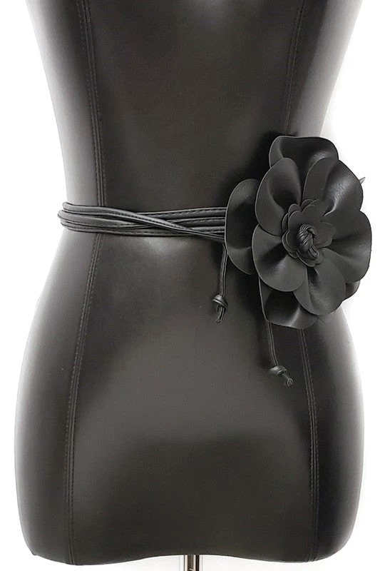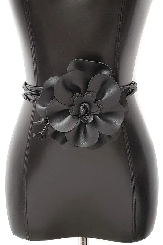 So dramatic! This 6″ black faux leather flower belt with long ties is the just the bold accessory so many outfits are calling for!
