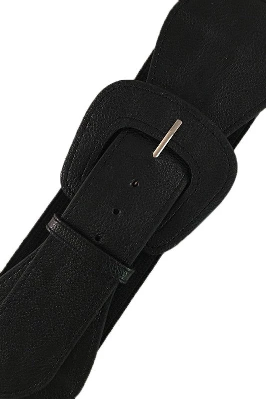 Matte black faux leather 3″ wide adjustable elastic belt with angled self buckle