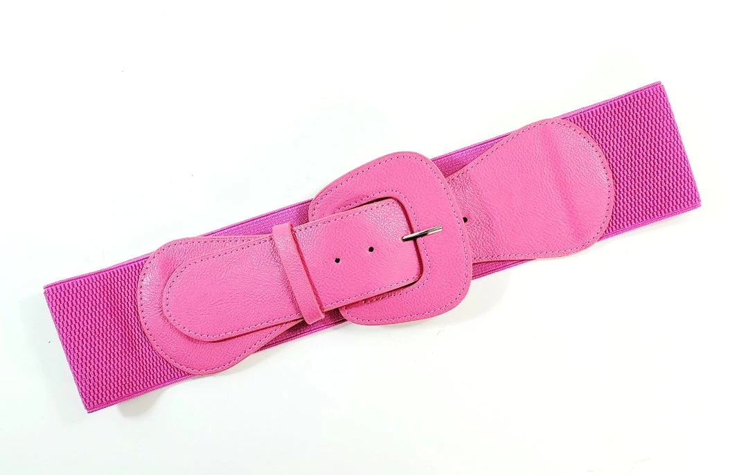 Matte deep pink faux leather 3″ wide adjustable elastic belt with angled self buckle. Elastic on this colorway is fuchsia (a little more purple than the buckle)