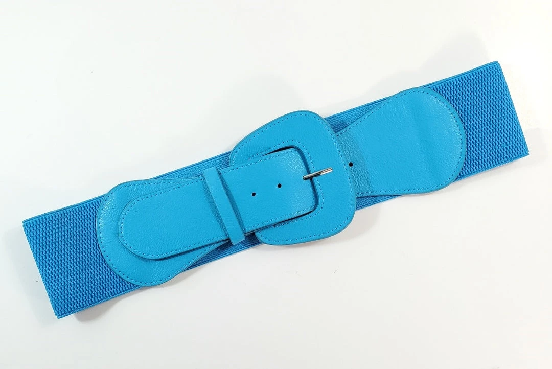 Matte rich sky blue faux leather 3″ wide adjustable elastic belt with angled self buckle
