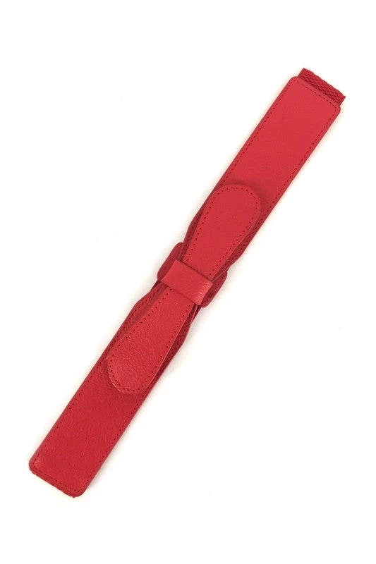 Matte red faux leather and elastic 1.5″ wide belt with center front bow design and back snap closure.