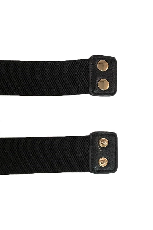 Matte black 1 3/4″ wide faux leather and elastic belt with with 7″ front bow detail and back snap closure