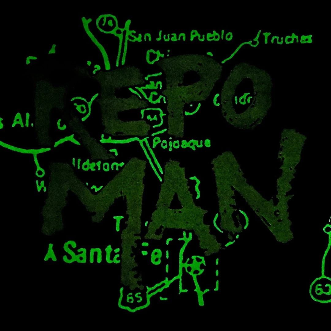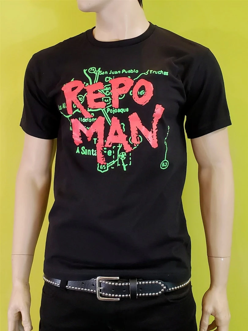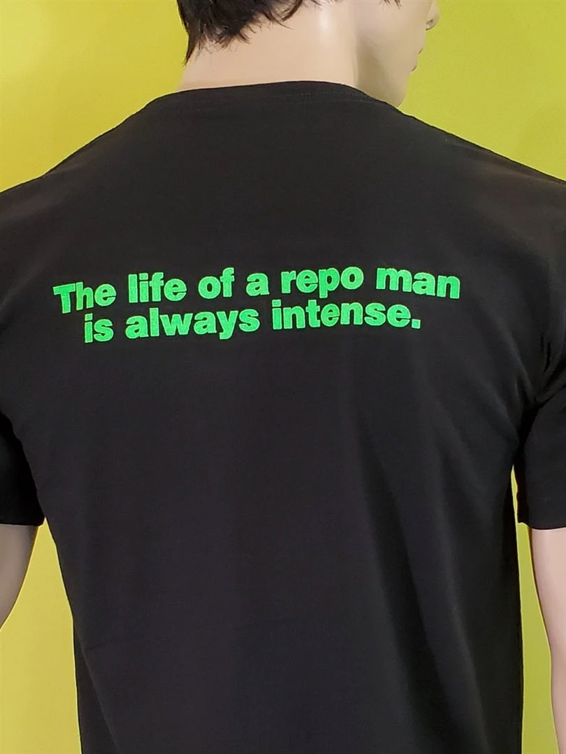 1984 Alex Cox sci-fi cult classic flick Repo Man glow-in-the-dark opening credits map & logo plastisol ink screenprint on fitted 100% cotton black men’s sizing t-shirt, with “The life of a repo man is always intense.” back print.