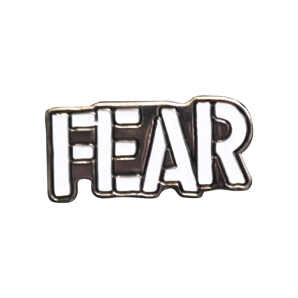 Silver metal and white enamel FEAR logo pin by Atom Age Industries