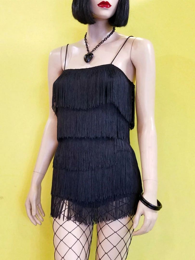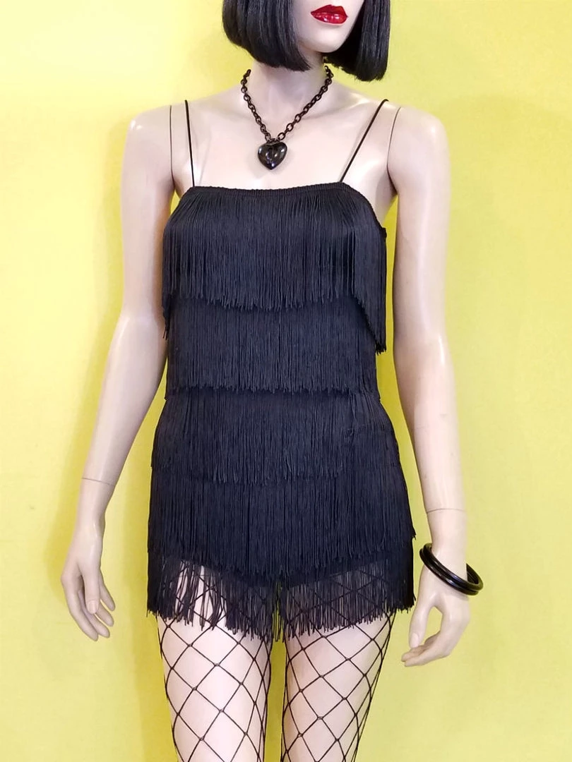 THE sassiest romper in town! Rows & rows of swingy 6″ black fringe on a simple black fitted soft stretch knit hot shorts spaghetti strap base –perfect for shimmy-ing the night (or day) away