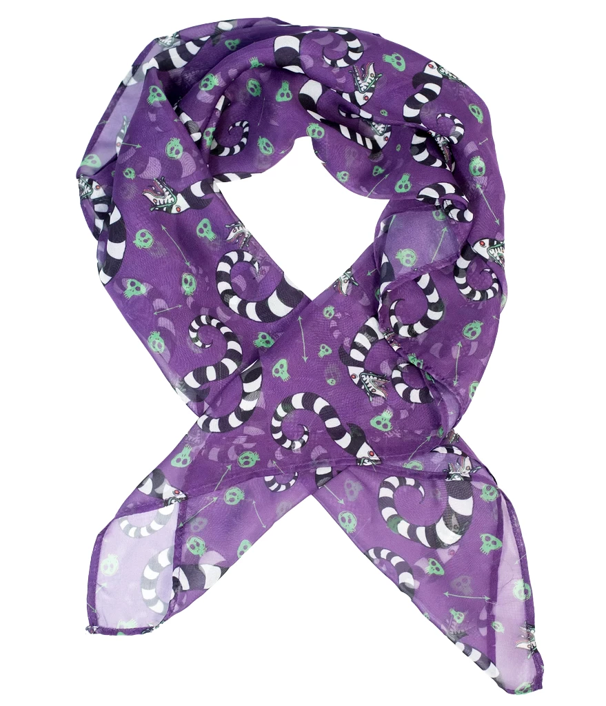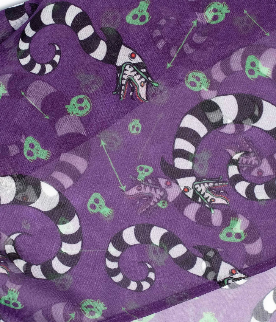 Beetlejuice x Unique Vintage collaboration retro style purple background allover stripey Sandworm and little green skulls print 28″ square sheer chiffon scarf –creepy cute in your hair or around your neck