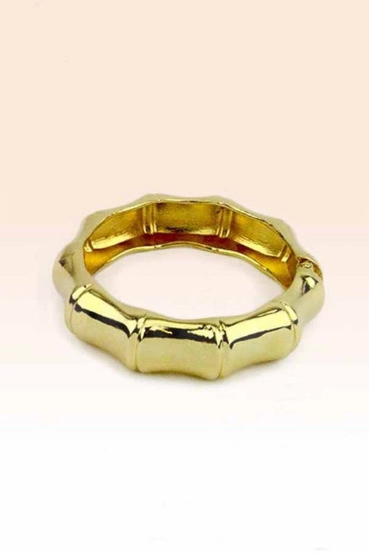 Sturdy shiny gold metal bamboo bangle with spring hinge and opening for an accommodating fit–a striking statement bracelet on its own, or great mixed into a stack of your faves!