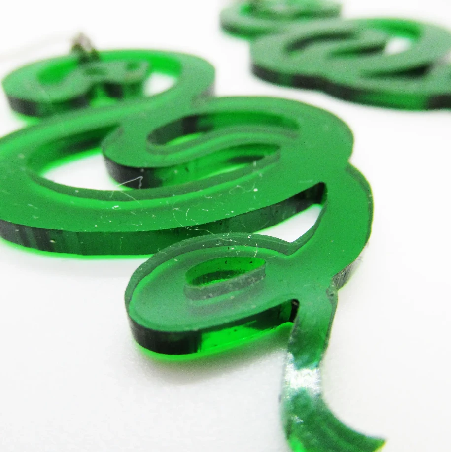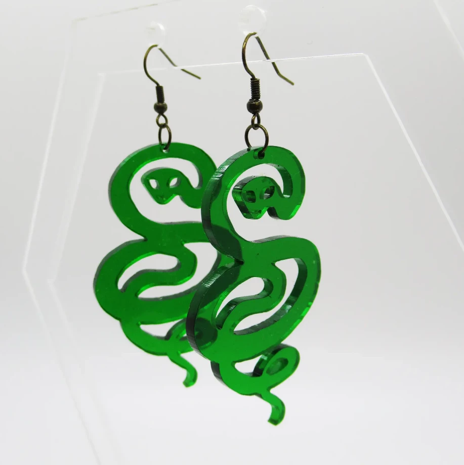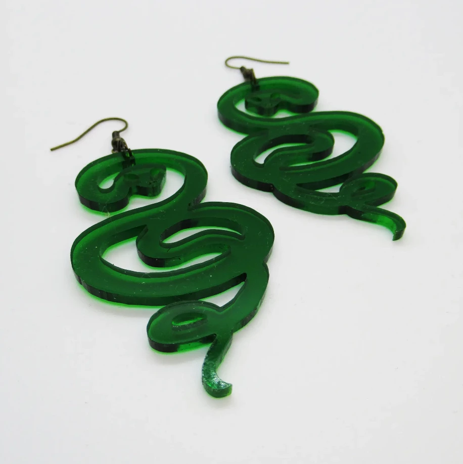 Striking 1 1/2″ x 3″ translucent green laser-cut acrylic coiled snake earrings with bronze hooks. Artist-made in the U.S.A. by Beqi Clothing.