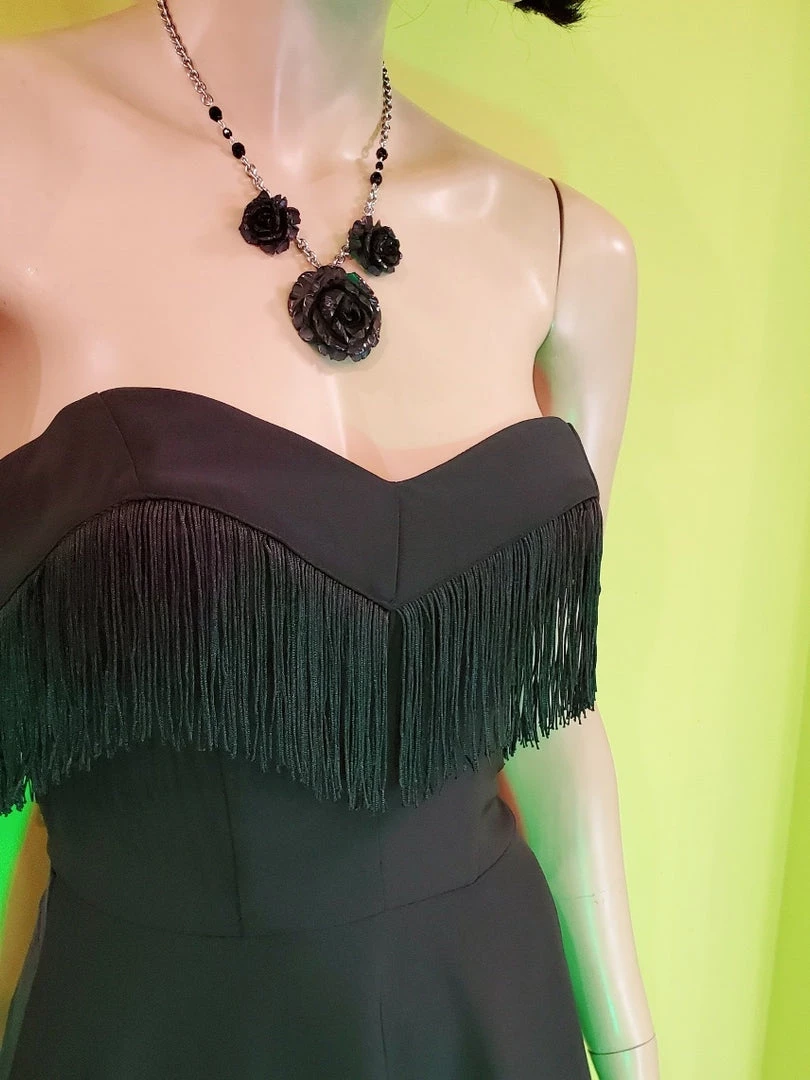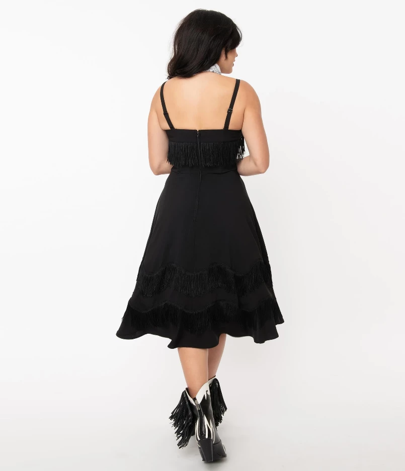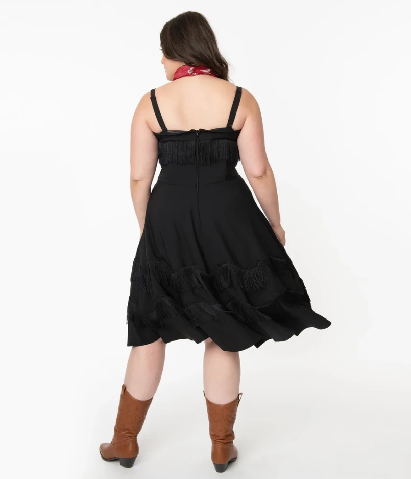 Get ready to twirl! The Girlie Dress in black from Unique Vintage is embellished with 3″ black fringe and features a princess-seamed structured bodice with sweetheart neckline, removable adjustable straps, and a full swing skirt in a below the knee length that’s perfect for fluffing up with a crinoline.