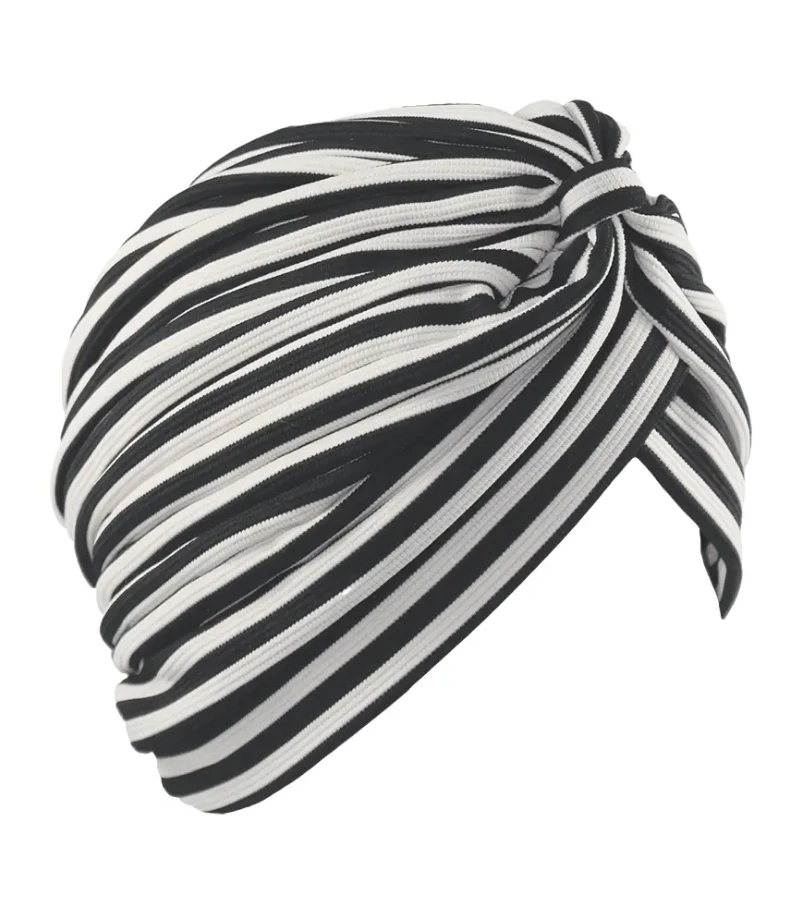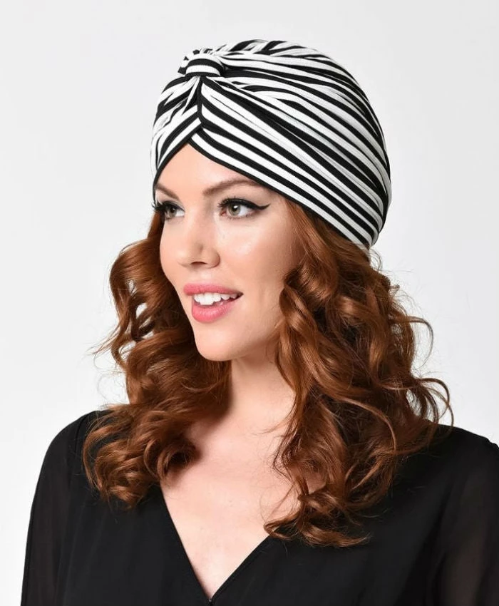 Vintage-inspired knotted turban in fun black & creamy white stripes from Unique Vintage –a glamorous way to top off retro or modern outfits!