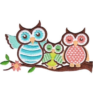 Three sweet and friendly (one’s winking at ya!) retro owls perched on a flowering tree branch embroidered patch.