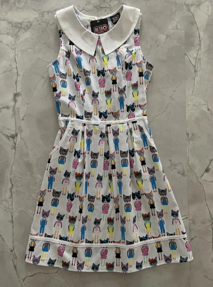 Too cute! The sleeveless, sassy length Cats Print Dress from Retrolicious features a white background allover kitties-in-colorful-clothes print with contrast white Peter Pan collar & piping details …and pockets, yay!