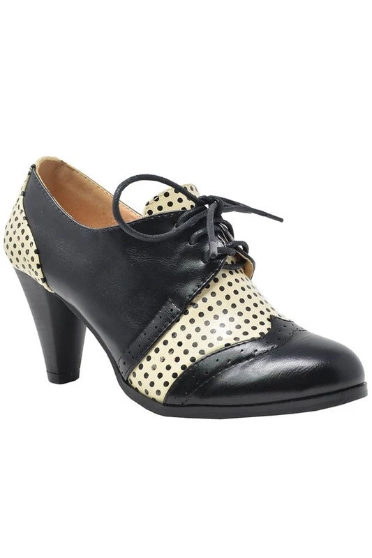 This timeless black & cream spectator Oxford pump with a fun dot update will be great with your retro or modern outfits!