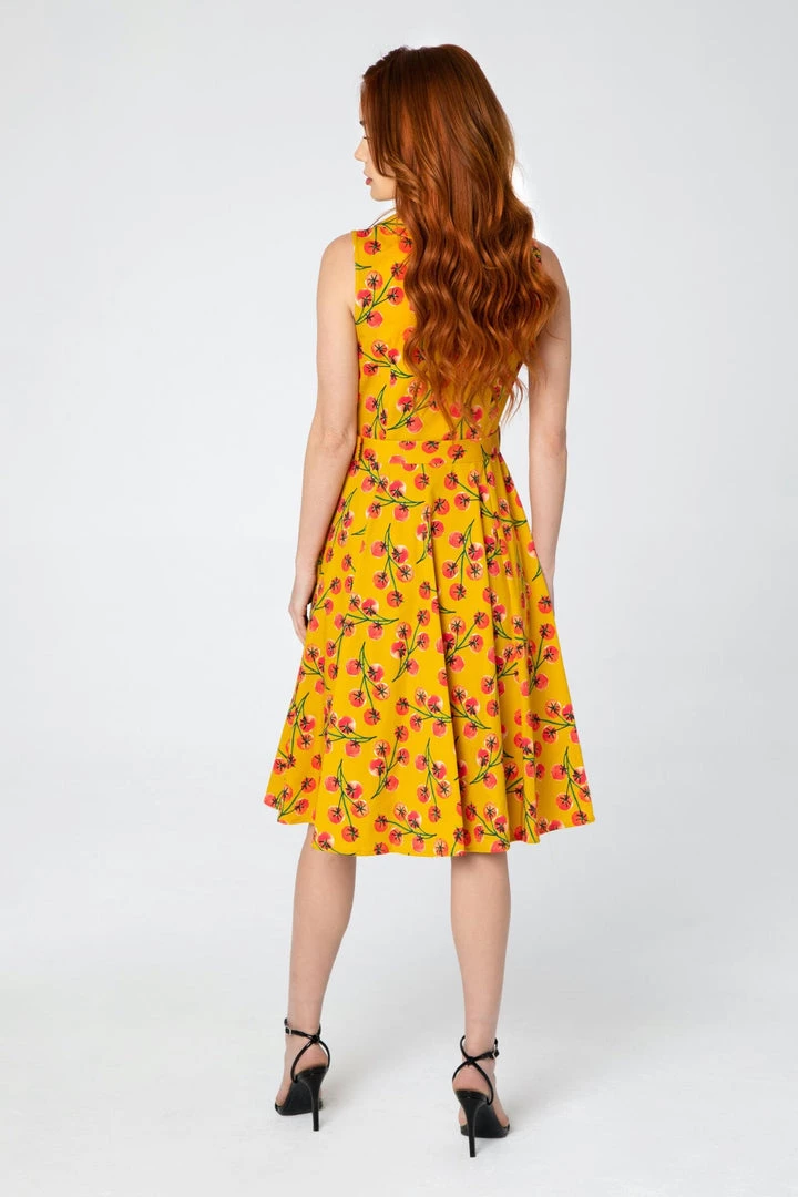 “Cherry Tomato Vine” mustard yellow background with watercolor effect red cherry tomatoes and green vines print dress from Miss Lulo –this sleeveless shirtwaist beauty features a fitted shawl collar button-front bodice, removable self belt with buckle, flared just below the knee length skirt…and pockets!