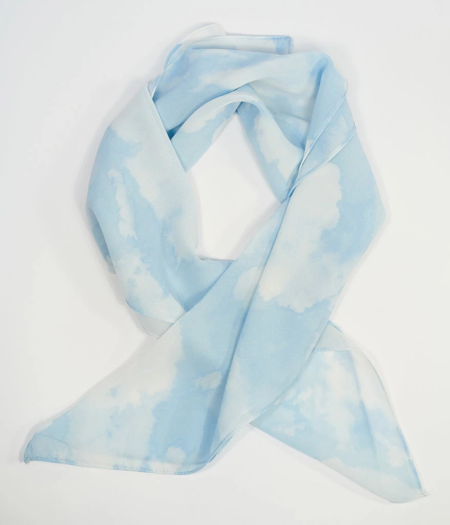 Vintage inspired semi-sheer blue & white cloud print chiffon square scarf by Unique Vintage.