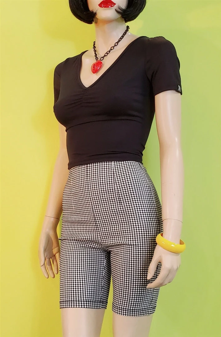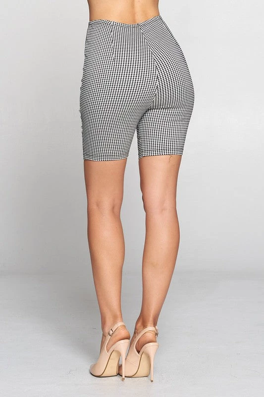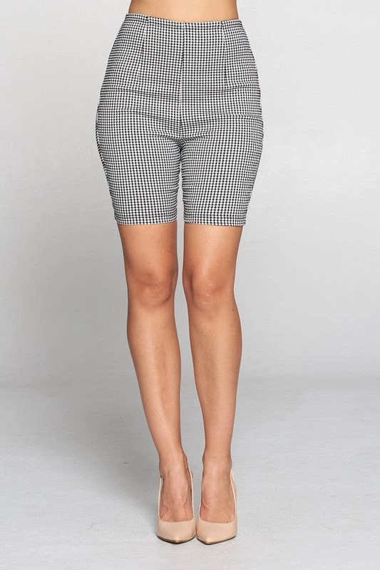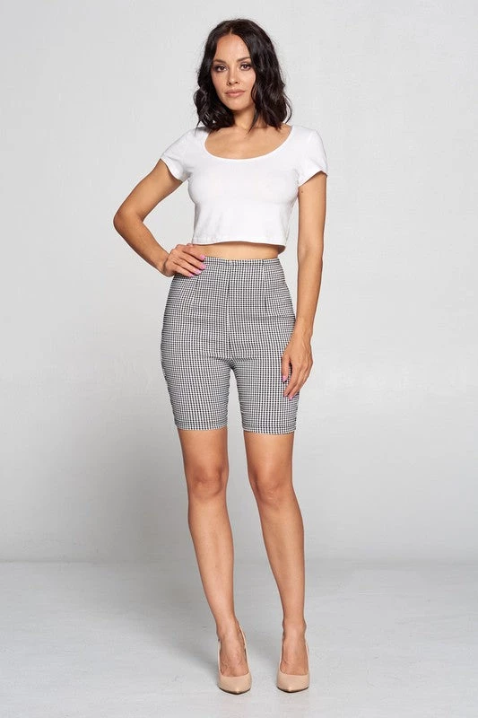 Super stretchy thick jacquard knit black, white, and grey check plaid high waist fitted mid-thigh length shorts –a sassy retro style that’s as comfy as leggings, whoo-hoo!