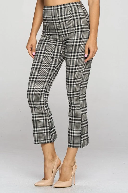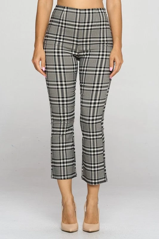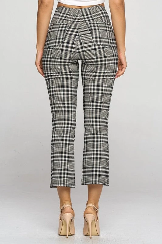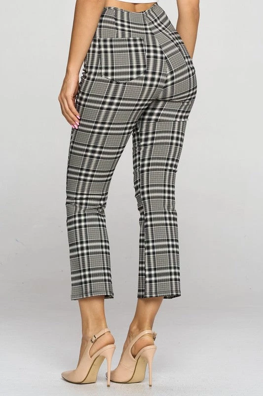 Stretchy and comfy black, white, and tan plaid high-waist cropped length fitted pants with slightly flared leg and back pockets