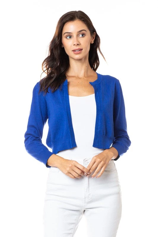 Super soft 3/4 sleeve open front “Bolero” cropped cardigan sweater in rich royal blue, featuring hook & eye closures at the neck –a sweet and cozy topper for retro or modern ensembles!