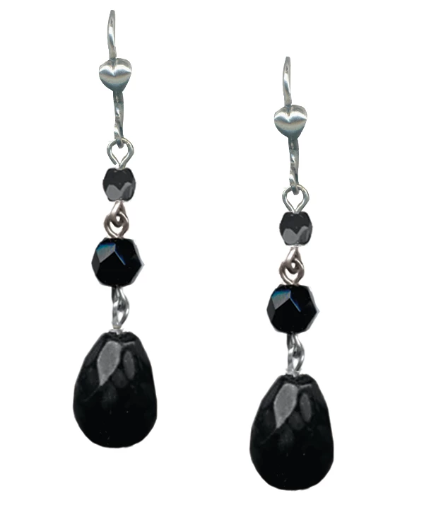 Sparkly jet black faceted glass beads dangle earrings with French (lever-back) hypoallergenic hooks. This pretty pair is a lovely accessory for retro or modern ensembles.