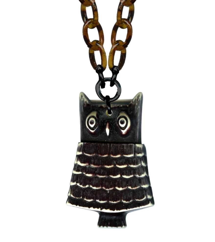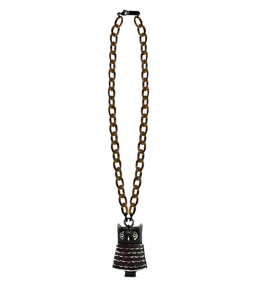 Sweet! Classic Hardware distressed brown & ivory Retrolite stylized owl pendant on 17″ tortoiseshell chunky plastic link chain