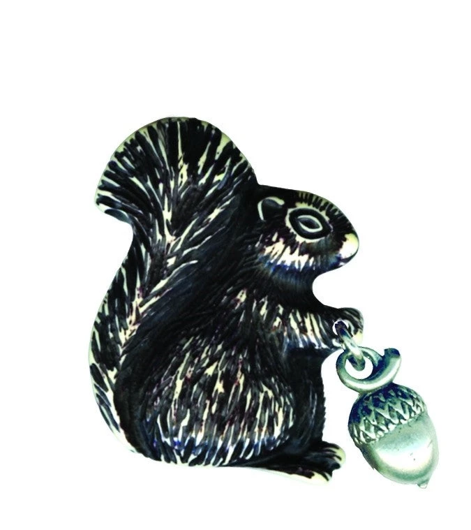 Chubby squirrel Retrolite pin in distressed black & ivory with dangling silver metal acorn–so cute, and perfect for accessorizing Fall outfits!