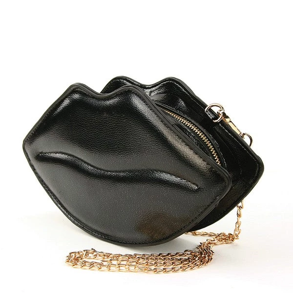 Shiny black lips faux leather lips clutch with detachable gold metal chain strap and zipper closure