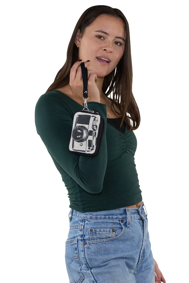 Black & creamy-tan canvas printed 35mm Camera image rectangular pouch with two zipper closure compartments, and detachable wristlet strap