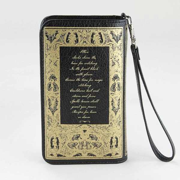Perfect for containing your witchy identification, currency, and all the receipts and little slips of paper you collect along the way –this textured black faux leather with metallic gold print book-shaped “The Witch’s Companion” wallet features a snap closure, zipper closure compartment that’ll fit an up to 3″ x 5.5″ phone, bill pockets, clear ID slot, and 9 credit card slots. Lined with sturdy black fabric. Includes detachable wristlet strap