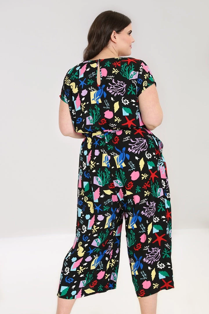 The relaxed fit Cora Jumpsuit by Hell Bunny in striking black background bright multi-color undersea motif print features short sleeves, flattering v-neck surplice bodice, keyhole opening with button fastener at nape, elasticized waist with self sash belt, cropped length inseam,..and pockets, yay!
