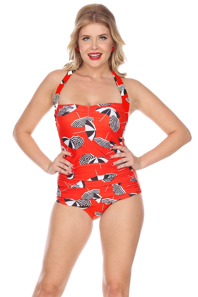 The ultimate vintage one-piece swimsuit reminiscent of classic 50s styles. This cheerful orange background beach umbrella print beauty features a halter tie at the neck, soft cups