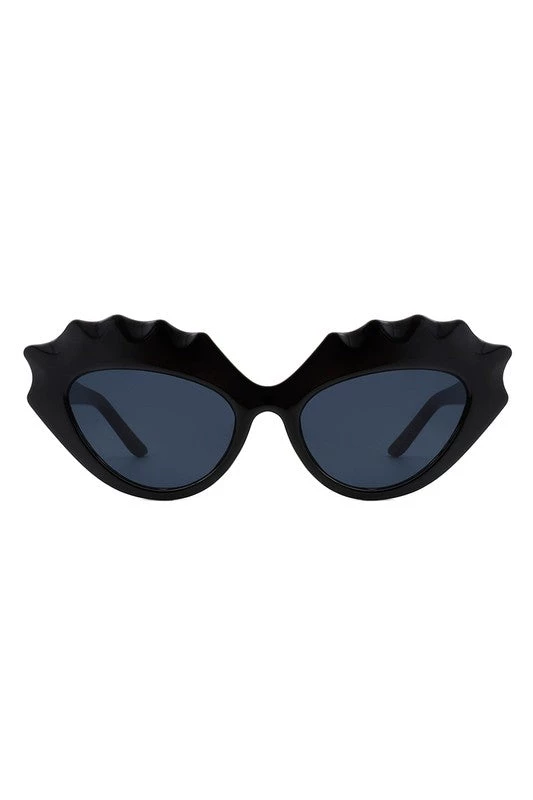 Reminiscent of quirky true vintage sunglasses, these sturdy cat eye black plastic frames with bold “carved” upper eyelashes detail and dark smoke lens are perfect for adding some drama and glamour to your modern or retro ensembles!