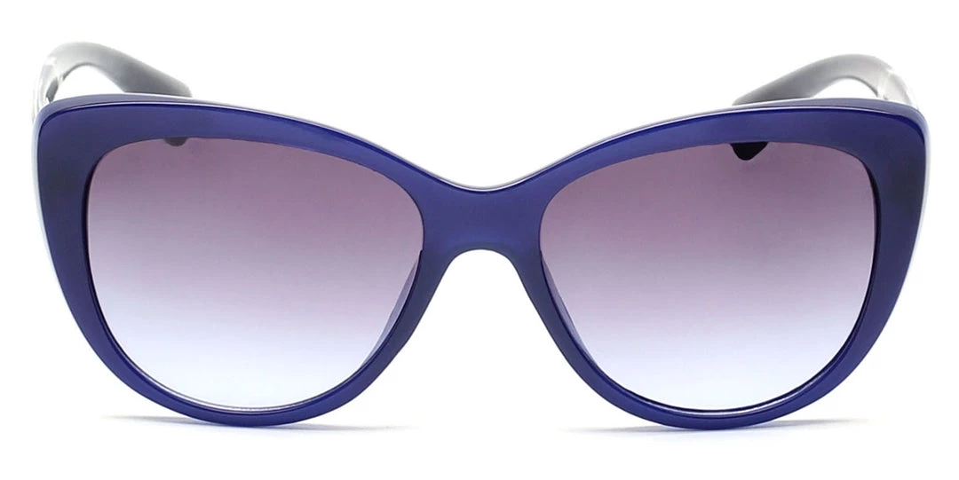 Rounded cat eye translucent royal blue plastic frame sunglasses with striped black & clear lace pattern arms