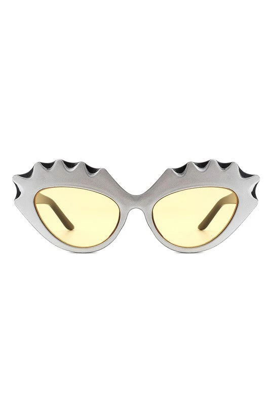 Reminiscent of quirky true vintage sunglasses, these sturdy cat eye black plastic frames with bold “carved” upper eyelashes detail in metallic silver and yellow lens are perfect for adding some drama and glamour to your modern or retro ensembles!
