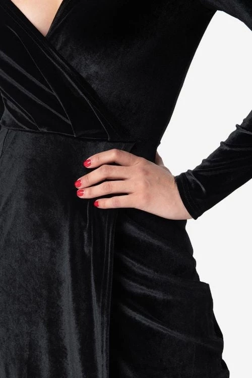 Gorgeous inky black stretch velvet Damsel Wiggle Dress from Unique Vintage –featuring long sleeves, deep v-neckline, and flattering faux-wrap fitted silhouette