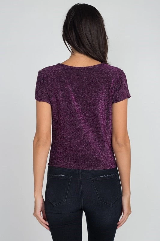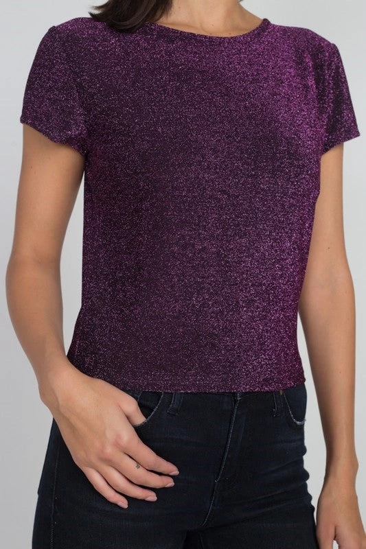 This sparkly metallic purple stretch knit short sleeve top with darted bust in slightly cropped length is ready to party!