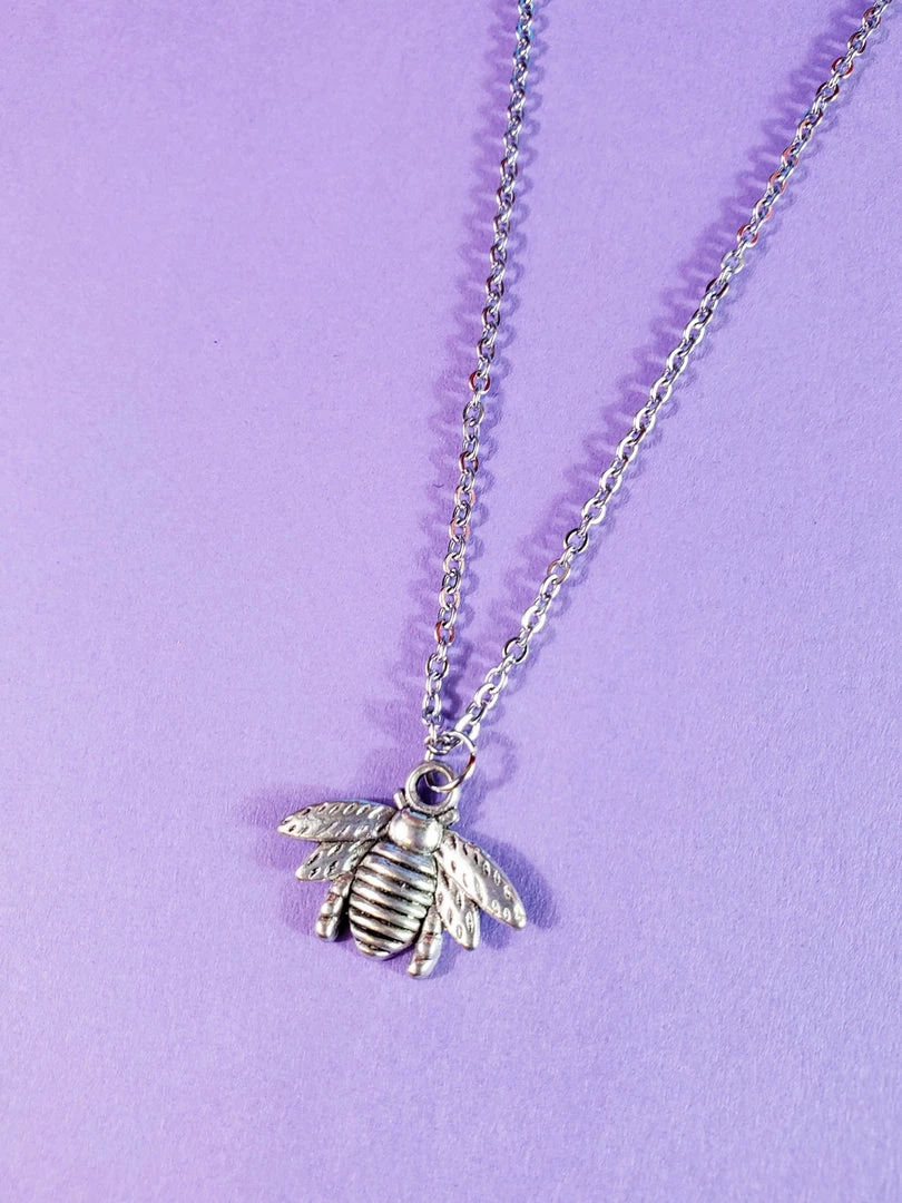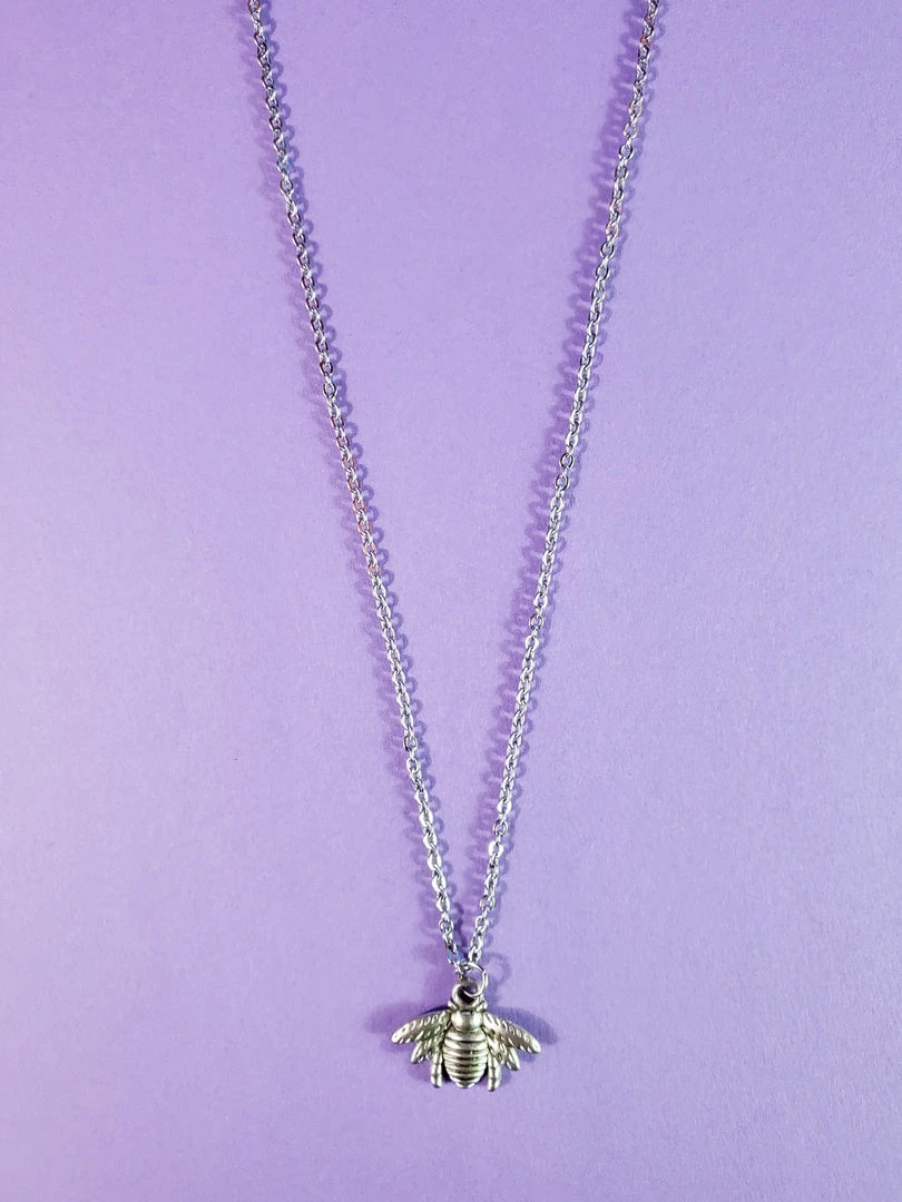 Sweet little silver metal bee pendant on delicate silver metal link chain with lobster claw clasp.