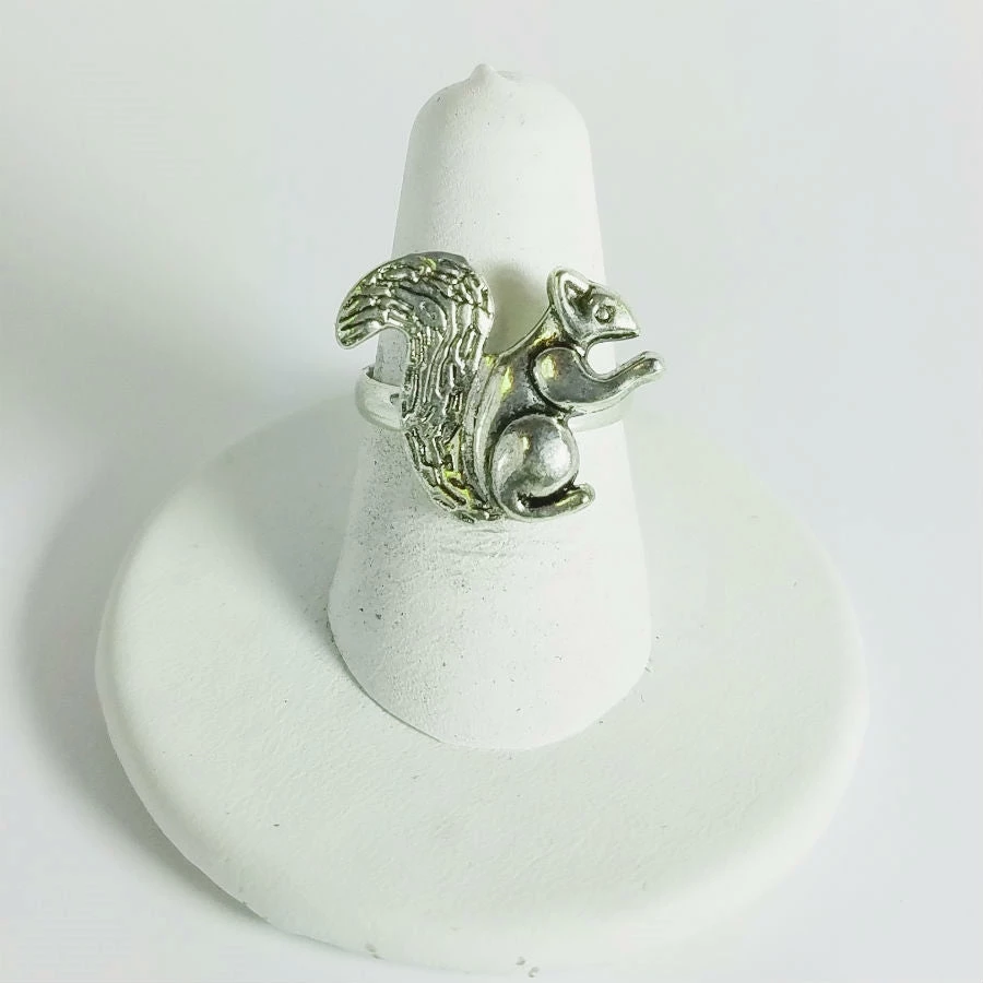 Super cute silver metal squirrel with a very fluffy tail on an adjustable band