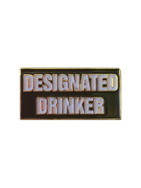 “Designated Drinker” in white block letters on black background rectangular gold metal enameled pin